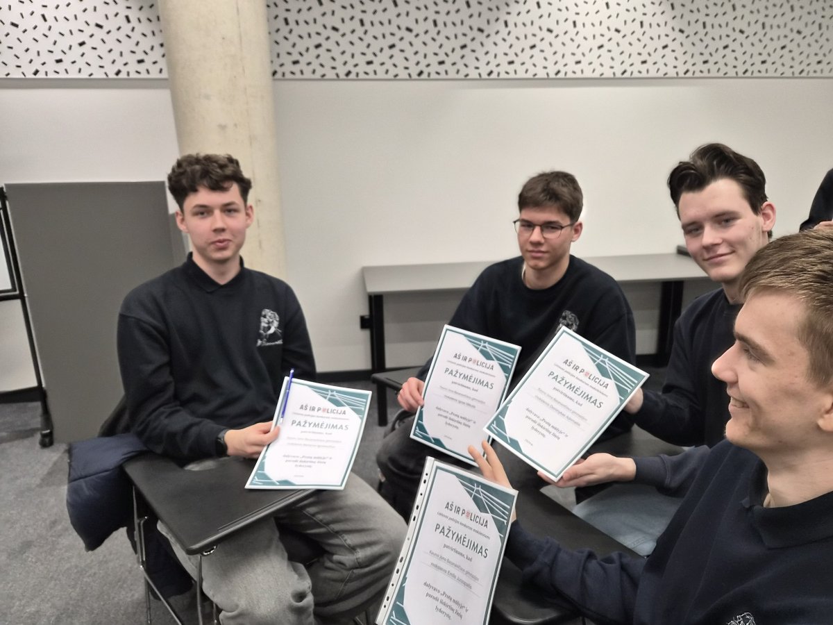 Kovo 26 d. Kauno policijoje vykusiame konkurse dalyvavo II AI klasės mokinių komanda: Dominykas Adomaitis, Martynas Ignatavičius, Ignas Mikutis ir Emilis Juozapaitis.